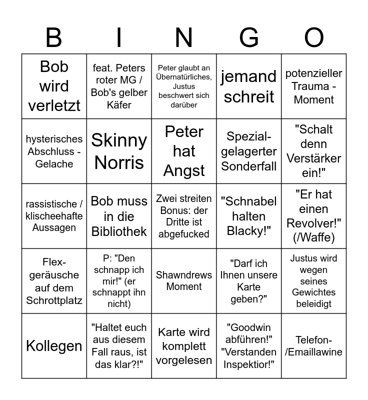 This bingo card has 25 words: P: "Den schnapp ich mir!" (er schnappt ihn nicht), Karte wird komplett vorgelesen, Peter hat Angst, Kollegen, potenzieller Trauma - Moment, Bob wird verletzt, hysterisches Abschluss - Gelache, feat. Peters roter MG / Bob's gelber Käfer, "Schnabel halten Blacky!", Shawndrews Moment, Spezial- gelagerter Sonderfall, rassistische / klischeehafte Aussagen, "Darf ich Ihnen unsere Karte geben?", Justus wird wegen seines Gewichtes beleidigt, Skinny Norris, Telefon- /Emaillawine, "Er hat einen Revolver!" (/Waffe), Peter glaubt an Übernatürliches, Justus beschwert sich darüber, "Schalt denn Verstärker ein!", Bob muss in die Bibliothek, Zwei streiten Bonus: der Dritte ist abgefucked, "Haltet euch aus diesem Fall raus, ist das klar?!", Flex- geräusche auf dem Schrottplatz, jemand schreit and "Goodwin abführen!" "Verstanden Inspektior!".