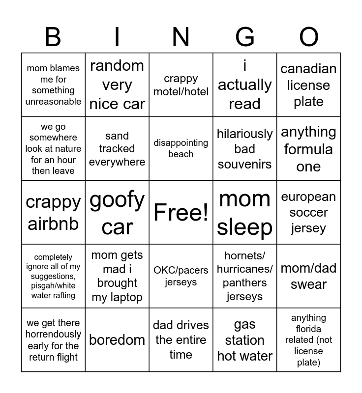 This bingo card has a free space and 24 words: mom gets mad i brought my laptop, boredom, disappointing beach, we get there horrendously early for the return flight, canadian license plate, mom blames me for something unreasonable, we go somewhere look at nature for an hour then leave, random very nice car, mom sleep, OKC/pacers jerseys, hilariously bad souvenirs, crappy airbnb, hornets/ hurricanes/ panthers jerseys, mom/dad swear, sand tracked everywhere, gas station hot water, european soccer jersey, crappy motel/hotel, anything formula one, goofy car, anything florida related (not license plate), completely ignore all of my suggestions, pisgah/white water rafting, i actually read and dad drives the entire time.