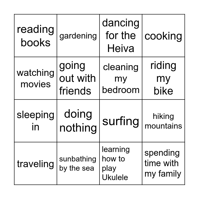 This bingo card has 16 words: sunbathing by the sea, hiking mountains, dancing for the Heiva, reading books, sleeping in, gardening, surfing, learning how to play Ukulele, watching movies, going out with friends, traveling, cooking, doing nothing, riding my bike, cleaning my bedroom and spending time with my family.