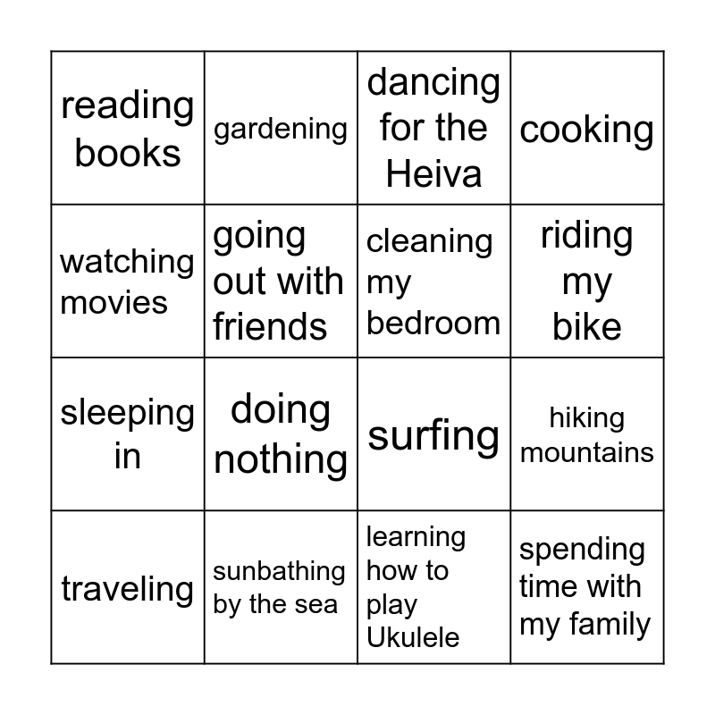 This bingo card has 16 words: sunbathing by the sea, hiking mountains, dancing for the Heiva, reading books, sleeping in, gardening, surfing, learning how to play Ukulele, watching movies, going out with friends, traveling, cooking, doing nothing, riding my bike, cleaning my bedroom and spending time with my family.