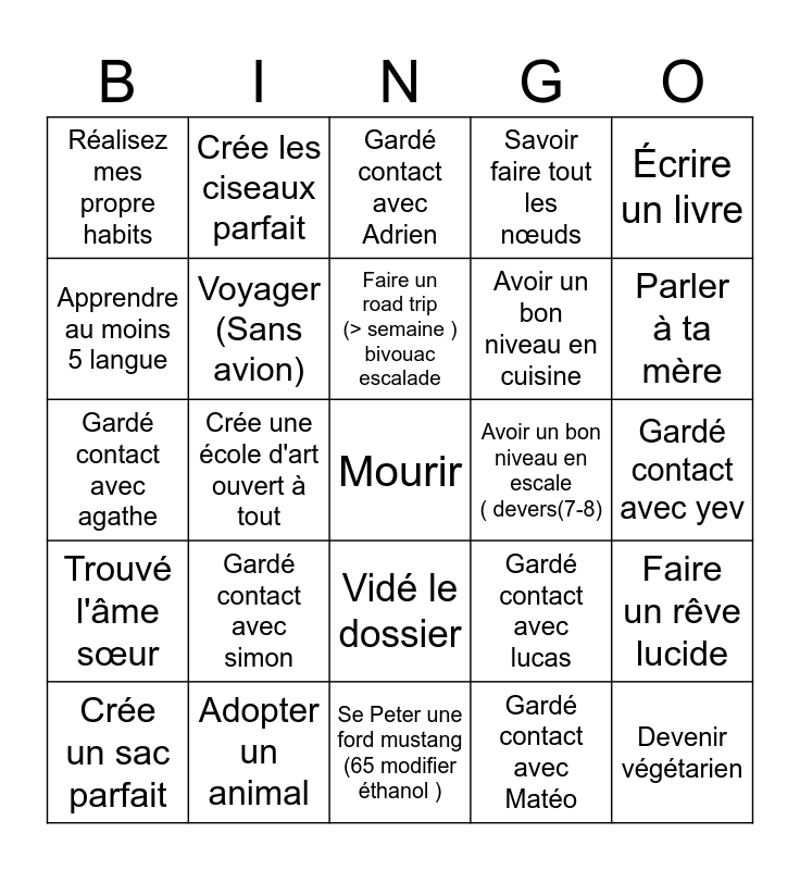 This bingo card has a free space and 24 words: Crée un sac parfait, Gardé contact avec simon, Faire un road trip (> semaine ) bivouac escalade, Gardé contact avec Matéo, Écrire un livre, Réalisez mes propre habits, Crée les ciseaux parfait, Gardé contact avec Adrien, Avoir un bon niveau en escale ( devers(7-8), Gardé contact avec yev, Gardé contact avec agathe, Voyager (Sans avion), Gardé contact avec lucas, Faire un rêve lucide, Apprendre au moins 5 langue, Adopter un animal, Se Peter une ford mustang (65 modifier éthanol ), Savoir faire tout les nœuds, Parler à ta mère, Trouvé l'âme sœur, Crée une école d'art ouvert à tout, Vidé le dossier, Avoir un bon niveau en cuisine and Devenir végétarien.