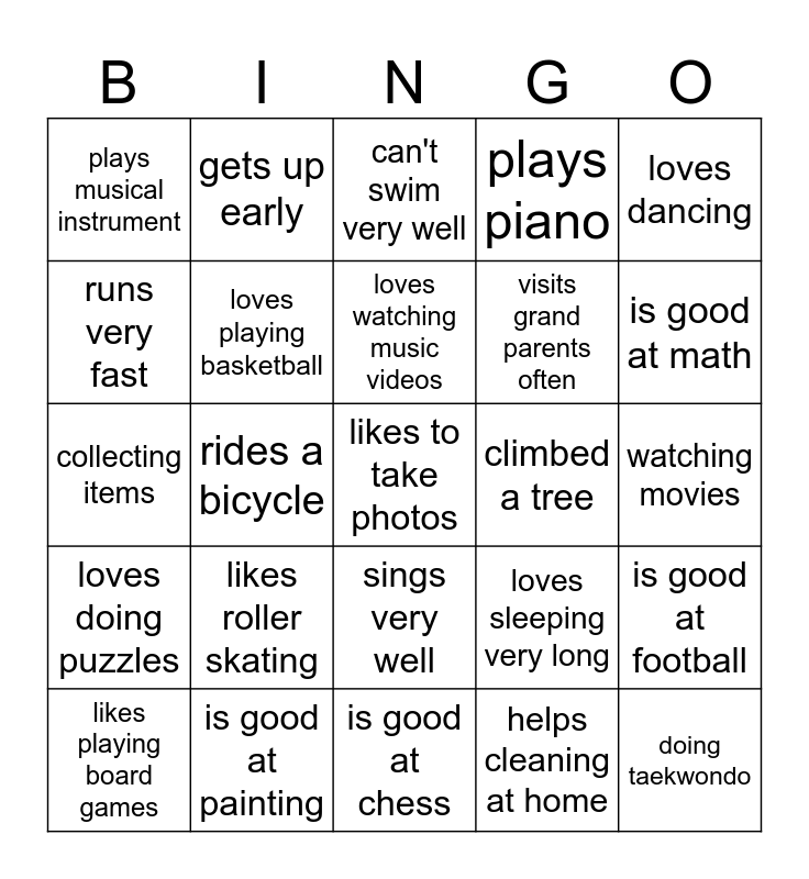 This bingo card has 30 words: is good at painting, enjoys reading novels, rides a bicycle, doesn't like video games, plays musical instrument, can't swim very well, loves playing basketball, sings very well, climbed a tree, is good at chess, watching movies, likes to take photos, helps cleaning at home, doing taekwondo, is good at math, plays table tennis, loves sleeping very long, loves doing puzzles, likes roller skating, loves dancing, collecting items, doesn't watch football, gets up early, visits grand parents often, runs very fast, plays piano, is good at football, likes playing board games, loves watching music videos and loves making friends.
