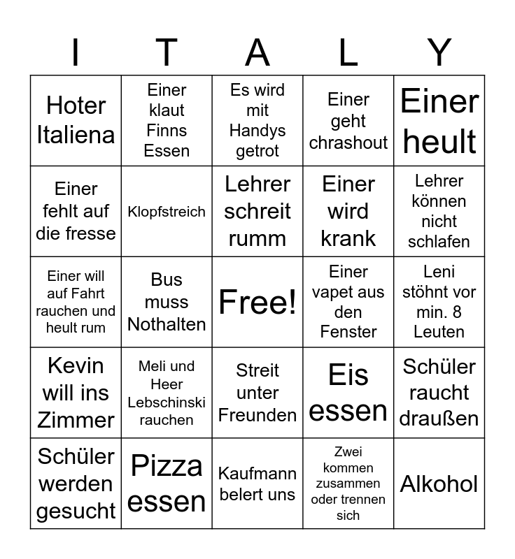 This bingo card has a free space and 24 words: Meli und Heer Lebschinski rauchen, Pizza essen, Lehrer schreit rumm, Schüler werden gesucht, Einer heult, Hoter Italiena, Einer fehlt auf die fresse, Einer klaut Finns Essen, Einer vapet aus den Fenster, Streit unter Freunden, Einer wird krank, Einer will auf Fahrt rauchen und heult rum, Eis essen, Schüler raucht draußen, Klopfstreich, Zwei kommen zusammen oder trennen sich, Leni stöhnt vor min. 8 Leuten, Es wird mit Handys getrot, Lehrer können nicht schlafen, Bus muss Nothalten, Alkohol, Kevin will ins Zimmer, Einer geht chrashout and Kaufmann belert uns.