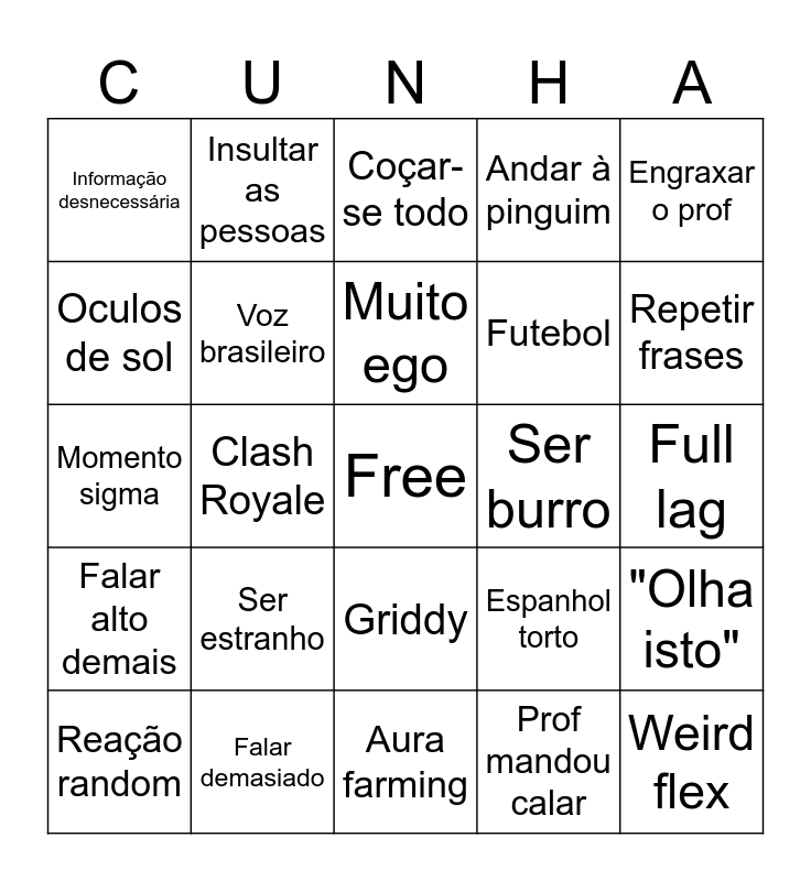 This bingo card has a free space and 36 words: Cantar a toa, Weird flex, Voz de personagem, Voz brasileiro, Espanhol torto, Falar alto demais, Muito ego, Riso estupido, Engraxar o prof, Opa/Epa, Clash Royale, Andar à pinguim, Dizer um ditado, Ser burro, Repetir frases, Informação desnecessária, Irmão, Ser estranho, Weird flex, Coçar-se todo, Full lag, "Olha isto", Falar demasiado, Reação random, Aura farming, Insultar as pessoas, Momento sigma, Duplo queixo, Futebol, Oculos de sol, "Eu faço bue isto", Roast random, Prof mandou calar, Griddy, Barba feita and Camisola clube.