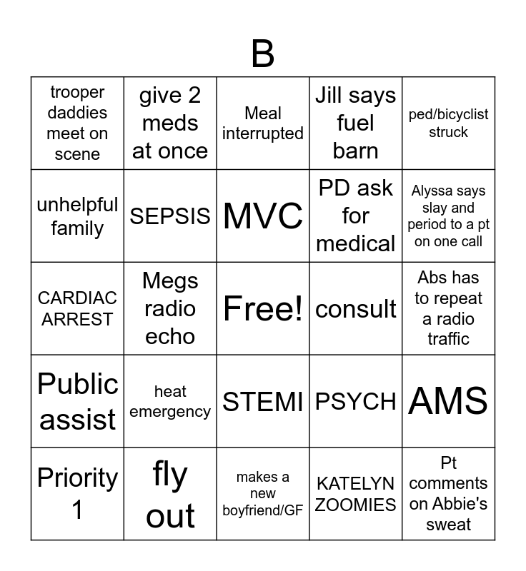 This bingo card has a free space and 24 words: heat emergency, fly out, MVC, Priority 1, ped/bicyclist struck, trooper daddies meet on scene, unhelpful family, give 2 meds at once, consult, STEMI, PD ask for medical, CARDIAC ARREST, PSYCH, AMS, SEPSIS, KATELYN ZOOMIES, Abs has to repeat a radio traffic, Meal interrupted, Alyssa says slay and period to a pt on one call, Megs radio echo, Pt comments on Abbie's sweat, Public assist, Jill says fuel barn and makes a new boyfriend/GF.