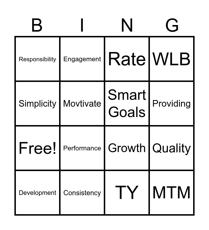 This bingo card has 20 words: Quality, Efficiency, Rate, SOP, Development, Simplicity, Consistency, Responsibility, Free!, Engagement, Performance, Growth, Movtivate, MTM, Smart Goals, Training, Providing, WLB, TY and Kindness.