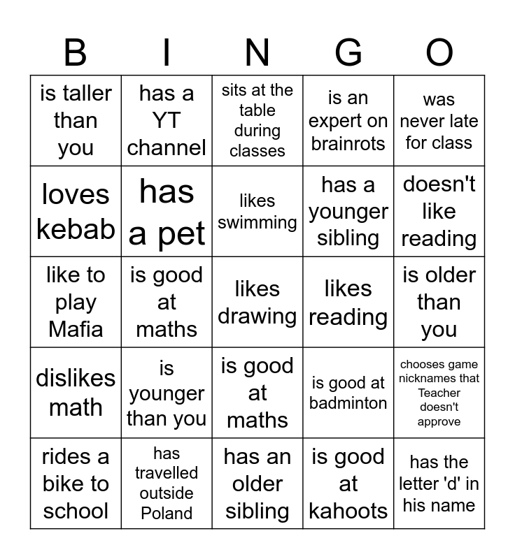 This bingo card has a free space and 39 words: is good at English, lives closest to HD school, likes music, has a pet, rides a bike to school, is good at maths, likes swimming, is the only child, was never late for class, dislikes math, is good at maths, is an expert on brainrots, has the letter 'd' in his name, is older than you, likes reading, is younger than you, doesn't live in Błonie, is taller than you, often loses his pen, is good at badminton, loves kebab, has an older sibling, has a younger sibling, doesn't like reading, is good at German, always wants to play Blooket, is not very talkative, gets to school on a scooter, knows many jokes, has a YT channel, edits films, wears headphones during classes, sits at the table during classes, has travelled outside Poland, is good at kahoots, never wants to work in pairs, chooses game nicknames that Teacher doesn't approve, like to play Mafia and decorates the book with drawings.
