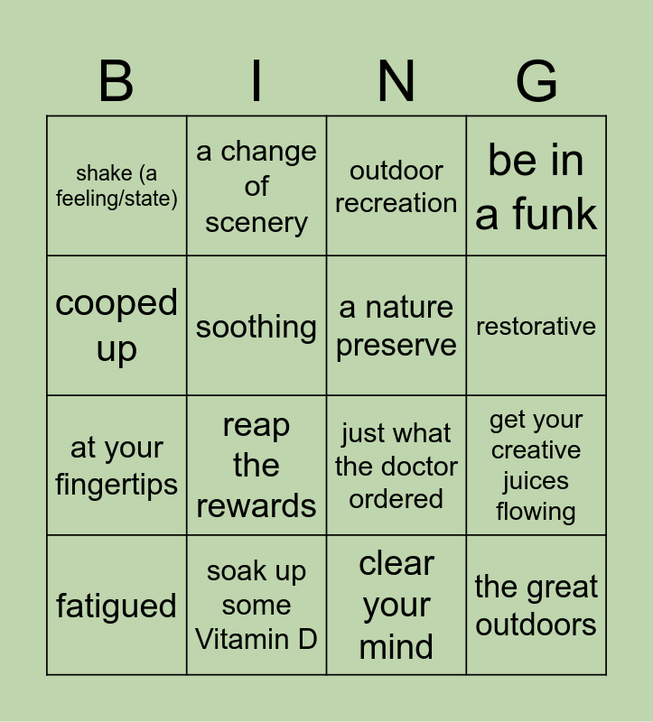 This bingo card has 16 words: soak up some Vitamin D, get your creative juices flowing, outdoor recreation, shake (a feeling/state), at your fingertips, a change of scenery, just what the doctor ordered, clear your mind, cooped up, soothing, fatigued, be in a funk, reap the rewards, restorative, a nature preserve and the great outdoors.