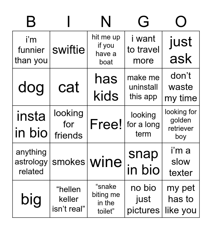 This bingo card has a free space and 24 words: smokes, “hellen keller isn’t real”, has kids, big, just ask, i’m funnier than you, dog, swiftie, looking for a long term, wine, make me uninstall this app, insta in bio, snap in bio, i’m a slow texter, cat, no bio just pictures, looking for golden retriever boy, hit me up if you have a boat, don’t waste my time, looking for friends, my pet has to like you, anything astrology related, i want to travel more and “snake biting me in the toilet”.
