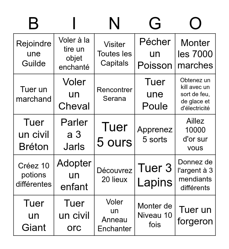 This bingo card has 55 words: Acheter une Maison, Tuer un Giant, Devenir un Vampire, Rejoindre une Guilde, Voler un Anneau Enchanter, Clear un Donjon, Voler un Cheval, Forger une Epée, Tuer une Poule, Récupérer 3 Livres de Talent, Pécher un Poisson, Visiter Solitude, Récupérer 5000 d'or, Acheter du Skooma, Se Marier, Contracter une Maladie, Monter les 7000 marches, Parler a 3 Jarls, Attraper un Papillon, Tuer 5 ours, Apprenez 5 sorts, Avoir un Follower, Tuer 3 Lapins, Visiter Toutes les Capitals, Manger 30 carrots, Rencontrer Serana, Monter de Niveau 10 fois, Collecter 5 gemmes étranges, Aillez 10000 d'or sur vous, Donnez de l'argent à 3 mendiants différents, Tuer un civil Nordique, Achetez une armure chez Grelka, Terminez 5 quêtes diverses, Enchanter un objet, Tuer un marchand, Tuer un civil Bréton, Récupérez 3 peaux différentes, Créez 10 potions différentes, Tuer un forgeron, Cuisinez 3 plats différents, Voler à la tire un objet enchanté, Découvrez un emplacement de sanctuaire, Parlez à 5 Jarls, Attraper une abeille, Adopter un enfant, Tuer un civil orc, Récupérez 150 flèches auprès des gardes de Solitude, Visiter Blancherive, Contracter 3 maladies à la fois, Obtenez un kill avec un sort de feu, de glace et d'électricité, Apprenez 20 sorts, Extraire 10 minerais, Tuez deux géants, Découvrez 20 lieux and Découvrez 10 effets d'ingrédients différents.