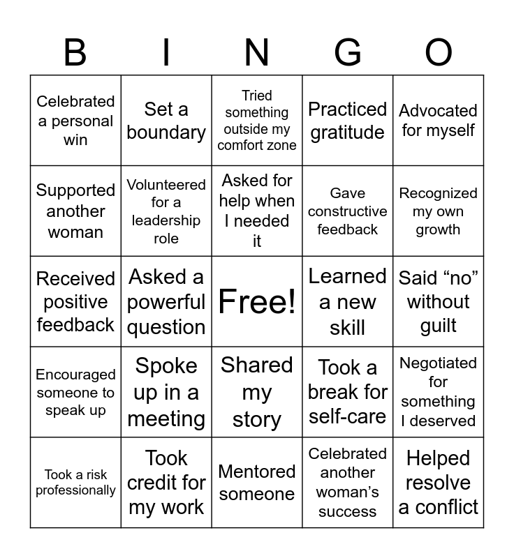 This bingo card has a free space and 25 words: Spoke up in a meeting, Mentored someone, Asked for help when I needed it, Took a risk professionally, Advocated for myself, Celebrated a personal win, Supported another woman, Set a boundary, Learned a new skill, Shared my story, Gave constructive feedback, Received positive feedback, Took a break for self-care, Negotiated for something I deserved, Volunteered for a leadership role, Lifted someone else up, Said “no” without guilt, Tried something outside my comfort zone, Recognized my own growth, Asked a powerful question, Helped resolve a conflict, Took credit for my work, Encouraged someone to speak up, Practiced gratitude and Celebrated another woman’s success.