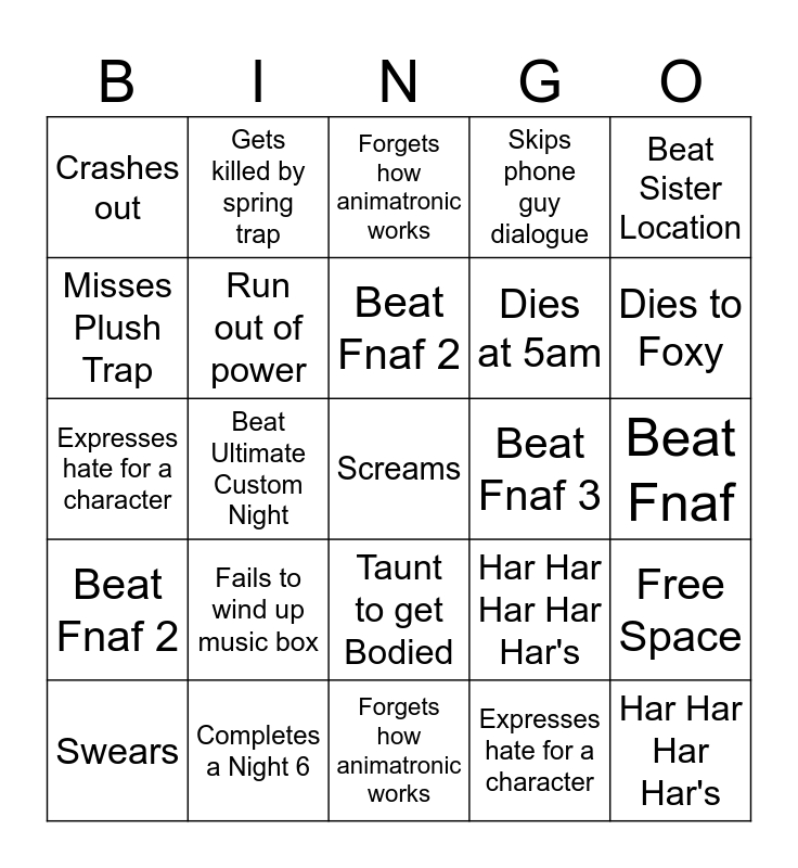 This bingo card has 51 words: Dies to Foxy, Screams, Swears, Forgets how animatronic works, Fails to wind up music box, Gets balloon boi'd, Gets killed by spring trap, Sees rare character, Misses Plush Trap, Completes a Night 6, Run out of power, Skips phone guy dialogue, Free Space, Har Har Har Har Har's, Boops Freddy's nose, Beat Fnaf, Beat Fnaf 2, Beat Fnaf 3, Beat Fnaf 4, Beat Sister Location, Beat Ultimate Custom Night, Expresses hate for a character, Crashes out, Dies at 5am, Taunt to get Bodied, Har Har Har Har's, Dies to Foxy, Screams, Swears, Forgets how animatronic works, Fails to wind up music box, Gets balloon boi'd, Gets killed by spring trap, Sees rare character, Misses Plush Trap, Completes a Night 6, Run out of power, Skips phone guy dialogue, Free Space, Boops Freddy's nose, Beat Fnaf, Beat Fnaf 2, Beat Fnaf 3, Beat Fnaf 4, Beat Sister Location, Beat Ultimate Custom Night, Expresses hate for a character, Crashes out, Dies at 5am, Taunt to get Bodied and Har Har Har Har's.