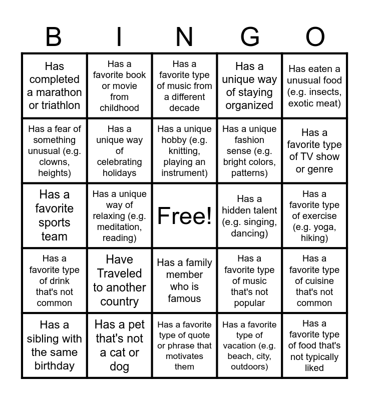 This bingo card has a free space and 24 words: Have Traveled to another country, Has a pet that's not a cat or dog, Has a unique hobby (e.g. knitting, playing an instrument), Has a sibling with the same birthday, Has eaten a unusual food (e.g. insects, exotic meat), Has completed a marathon or triathlon, Has a fear of something unusual (e.g. clowns, heights), Has a favorite book or movie from childhood, Has a hidden talent (e.g. singing, dancing), Has a family member who is famous, Has a unique fashion sense (e.g. bright colors, patterns), Has a favorite sports team, Has a favorite type of music that's not popular, Has a favorite type of cuisine that's not common, Has a unique way of celebrating holidays, Has a favorite type of vacation (e.g. beach, city, outdoors), Has a favorite type of exercise (e.g. yoga, hiking), Has a favorite type of music from a different decade, Has a favorite type of TV show or genre, Has a unique way of relaxing (e.g. meditation, reading), Has a favorite type of food that's not typically liked, Has a favorite type of drink that's not common, Has a unique way of staying organized and Has a favorite type of quote or phrase that motivates them.