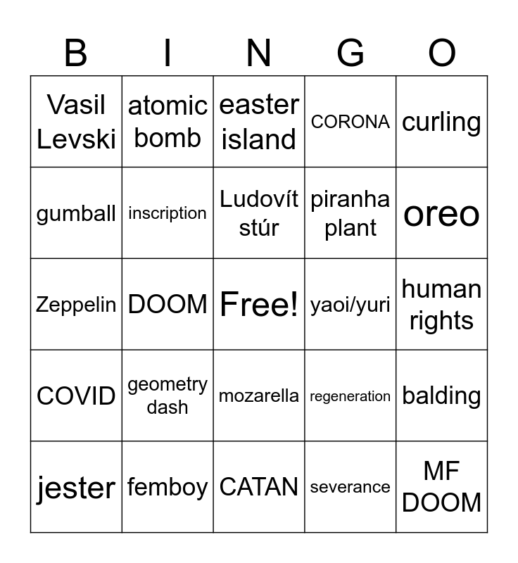 This bingo card has a free space and 24 words: geometry dash, femboy, Ludovít stúr, jester, curling, Vasil Levski, gumball, atomic bomb, yaoi/yuri, mozarella, piranha plant, Zeppelin, regeneration, balding, inscription, severance, human rights, easter island, oreo, DOOM, MF DOOM, COVID, CORONA and CATAN.