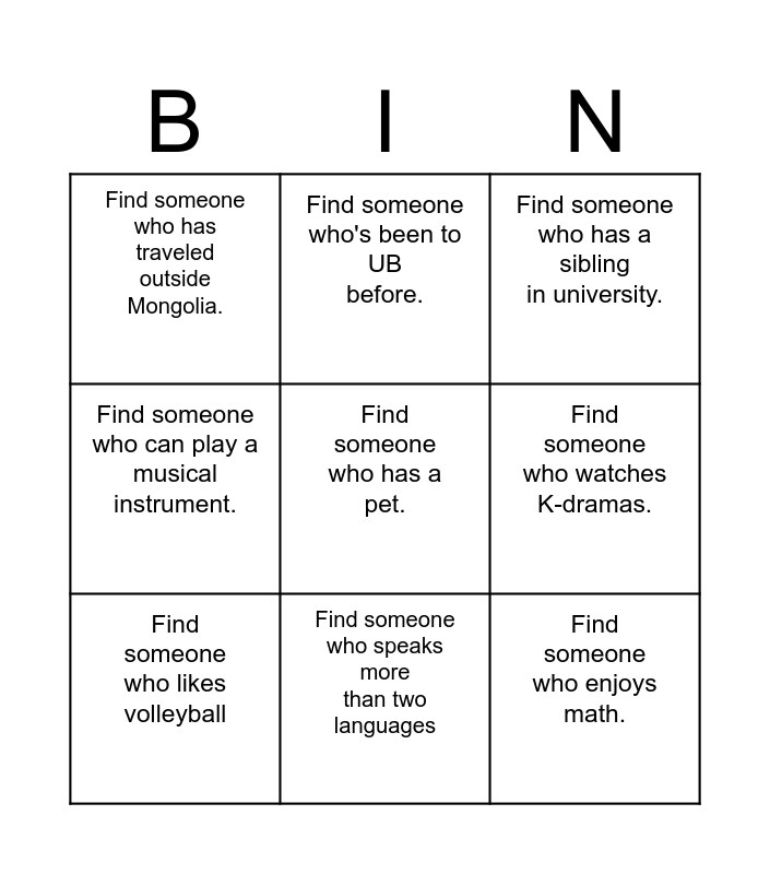 This bingo card has 9 words: Find someone who likes volleyball, Find someone who has a sibling in university., Find someone who's been to UB before., Find someone who can play a musical instrument., Find someone who has traveled outside Mongolia., Find someone who watches K-dramas., Find someone who has a pet., Find someone who enjoys math. and Find someone who speaks more than two languages.