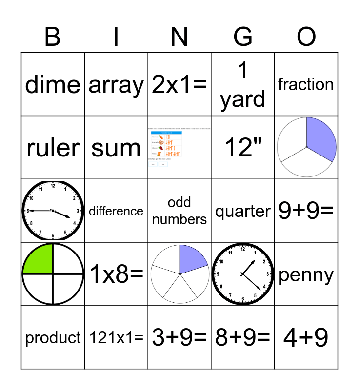 This bingo card has 9 images, a free space and 20 words: product, 0x8=, difference, 10x3=, dime, 2x1=, sum, 1x8=, quarter, 121x1=, 9+9=, 4+9, 3+9=, 8+9=, fraction, 12", ruler, 1 yard, array and penny.