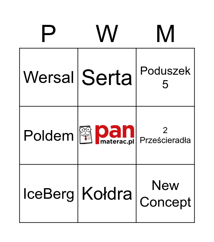 This bingo card has a free space and 8 words: 2 Prześcieradła, Poduszek 5, Serta, IceBerg, Wersal, New Concept, Poldem and Kołdra.
