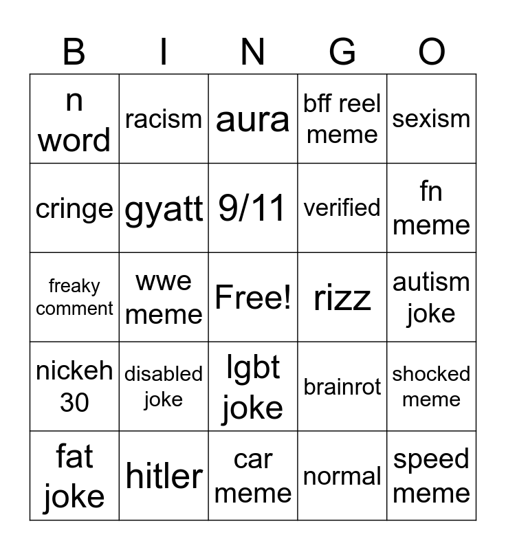 This bingo card has a free space and 24 words: disabled joke, hitler, 9/11, fat joke, sexism, n word, cringe, racism, rizz, lgbt joke, verified, freaky comment, brainrot, shocked meme, gyatt, normal, autism joke, aura, fn meme, wwe meme, speed meme, nickeh 30, bff reel meme and car meme.