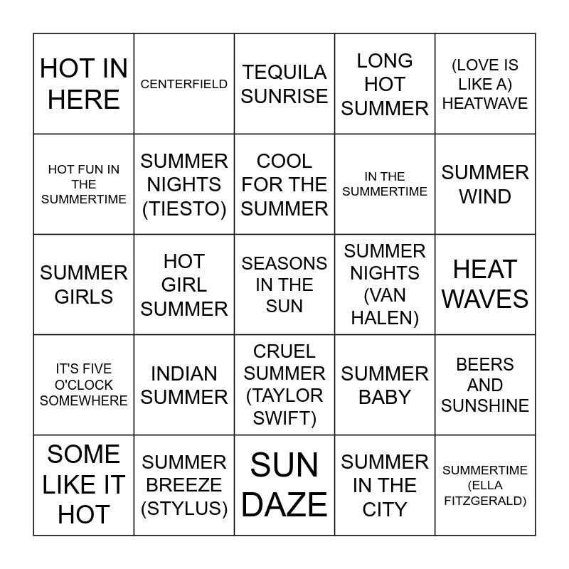 This bingo card has 65 words: ALL SUMMER LONG, BAREFOOT BLUE JEAN NIGHT, BEAT THIS SUMMER, BEERS AND SUNSHINE, BLISTER IN THE SUN, CALIFORNIA GIRLS, CENTERFIELD, COME DANCING, COOL FOR THE SUMMER, CRUEL SUMMER (BANANARAMA), CRUEL SUMMER (TAYLOR SWIFT), ENDLESS SUMMER NIGHTS, HEAT WAVES, (LOVE IS LIKE A) HEATWAVE, HOLIDAY ROAD, HOT FUN IN THE SUMMERTIME, HOT GIRL SUMMER, HOT IN HERE, HOT STUFF, IN THE SUMMERTIME, INDIAN SUMMER, IT'S FIVE O'CLOCK SOMEWHERE, LONG HOT SUMMER, MEDLEY: SUMMER LOVE, OUR LAST SUMMER, ROLLLERCOASTER, SANTA MONICA, SCHOOL'S OUT, SEASONS IN THE SUN, SINGLE FOR THE SUMMER, SOME LIKE IT HOT, STEAL MY SUNSHINE, SUDDENLY LAST SUMMER, SUMMER, SUMMER BABY, SUMMER BREEZE (STYLUS), SUMMER BREEZE (SEALS & CROFTS), SUMMER GIRLS, SUMMER IN THE CITY, SUMMER NIGHT CITY, SUMMER NIGHTS (TIESTO), SUMMER NIGHTS (STEVIE B), SUMMER NIGHTS (VAN HALEN), SUMMER NIGHTS (GREASE), SUMMER OF '69, SUMMER OF LOVE, SUMMER WIND, SUMMERTIME (DJ JJ & FP), SUMMERTIME (ELLA FITZGERALD), SUMMERTIME BLUES (EDDIE COCHRAN), SUMMERTIME (KENNY CHESNEY), SUMMERTIME BLUES (ZACH BRYAN), SUMMERTIME SADNESS, SUN DAZE, SUNKISSING, SUNNY AFTERNOON, SUNSHINE, TEQUILA SUNRISE, THE BOYS OF SUMMER, THE HEAT IS ON, THIS SUMMER, TOO HOT, VACATION, WALKING ON SUNSHINE and YOU TOOK THE WORDS RIGHT OUT OF MY MOUTH.