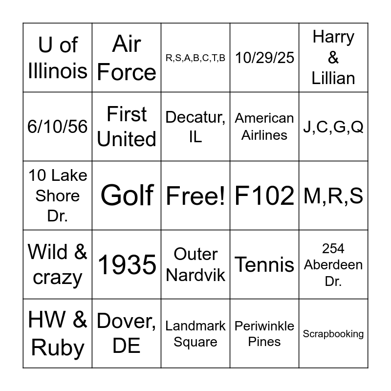 This bingo card has a free space and 24 words: 1935, Dover, DE, Decatur, IL, HW & Ruby, Harry & Lillian, U of Illinois, 6/10/56, Air Force, F102, Outer Nardvik, American Airlines, 10 Lake Shore Dr., Tennis, 254 Aberdeen Dr., First United, Periwinkle Pines, M,R,S, R,S,A,B,C,T,B, J,C,G,Q, Golf, Scrapbooking, Wild & crazy, 10/29/25 and Landmark Square.