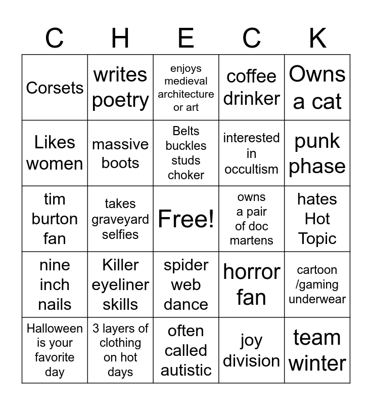 This bingo card has a free space and 24 words: Killer eyeliner skills, 3 layers of clothing on hot days, Belts buckles studs choker, Halloween is your favorite day, Owns a cat, Corsets, Likes women, writes poetry, owns a pair of doc martens, spider web dance, interested in occultism, tim burton fan, horror fan, cartoon /gaming underwear, massive boots, joy division, hates Hot Topic, enjoys medieval architecture or art, punk phase, takes graveyard selfies, team winter, nine inch nails, coffee drinker and often called autistic.