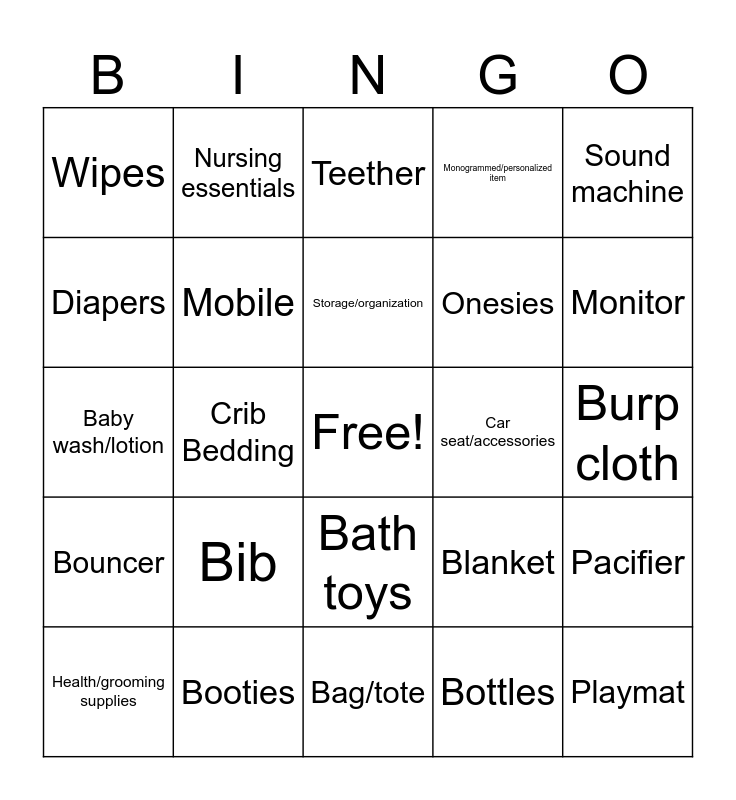 This bingo card has a free space and 25 words: Bib, Bag/tote, Storage/organization, Health/grooming supplies, Sound machine, Wipes, Diapers, Nursing essentials, Car seat/accessories, Bath toys, Onesies, Baby wash/lotion, Blanket, Pacifier, Mobile, Swaddle, Burp cloth, Teether, Monitor, Crib Bedding, Playmat, Booties, Bouncer, Monogrammed/personalized item and Bottles.