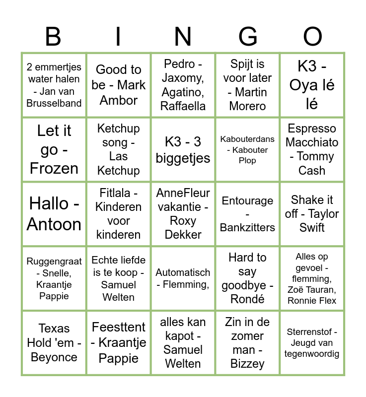 This bingo card has 45 words: Azizam - Ed Sheeran, AnneFleur vakantie - Roxy Dekker, Lotje - Lustrum U.V.S.V./N.V.V.S.U., Jopke Van Dobben, Texas Hold 'em - Beyonce, Noodgeval - Goldband, Zin in de zomer man - Bizzey, Pedro - Jaxomy, Agatino, Raffaella, Weekend - Bizzey, K3 - Oya lé lé, Feesttent - Kraantje Pappie, Spijt is voor later - Martin Morero, Entourage - Bankzitters, Automatisch - Flemming,, Echte liefde is te koop - Samuel Welten, Engelbewaarder - Marco Schuitmaker, alles kan kapot - Samuel Welten, Baila de gasolina - Effe Serieus, Hallo - Antoon, 100% - flemming, mart hoogkamer, Espresso Macchiato - Tommy Cash, Good to be - Mark Ambor, Fly like me - Chef'Special, Hier mag alles - Donnie, Marco Schuitmaker, 2 emmertjes water halen - Jan van Brusselband, Mona lisa - Robert Van Hemert, Shake it off - Taylor Swift, Stargazing - Myles Smith, Goud - Suzan en Freek, Hard to say goodbye - Rondé, Ruggengraat - Snelle, Kraantje Pappie, Vanavond - Kris Kross Amsterdam, Alles op gevoel - flemming, Zoë Tauran, Ronnie Flex, Beneden - Bizzey, Ronnie Flex, Russo, Wij gaan beginnen - Samon & Gert, Ga dan! - Roxy Dekker, Fitlala - Kinderen voor kinderen, Rampeneren - Yes-R, Partysquad, Ali B, Padellen - Turfy Gang, Sterrenstof - Jeugd van tegenwoordig, K3 - 3 biggetjes, Let it go - Frozen, Kabouterdans - Kabouter Plop, Macarena - Los Del Rio, Ketchup song - Las Ketchup and Hele vette boeren - Jorieke.