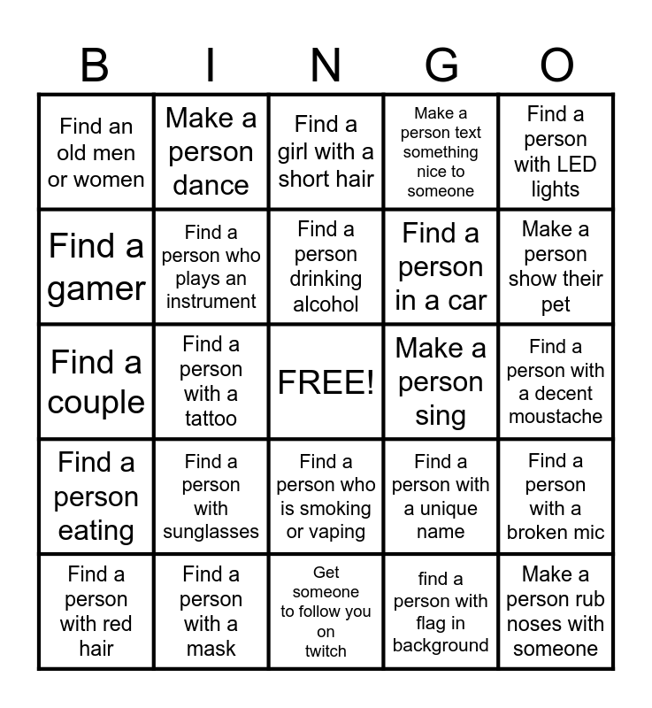 This bingo card has a free space and 24 words: Find a person with sunglasses, Find a person with a mask, Find a person drinking alcohol, Find a person with red hair, Find a person with LED lights, Find an old men or women, Find a gamer, Make a person dance, Make a person sing, Find a person who is smoking or vaping, Find a person in a car, Find a couple, Find a person with a unique name, Find a person with a broken mic, Find a person who plays an instrument, find a person with flag in background, Find a person with a decent moustache, Find a girl with a short hair, Make a person show their pet, Find a person with a tattoo, Make a person rub noses with someone, Find a person eating, Make a person text something nice to someone and Get someone to follow you on twitch.