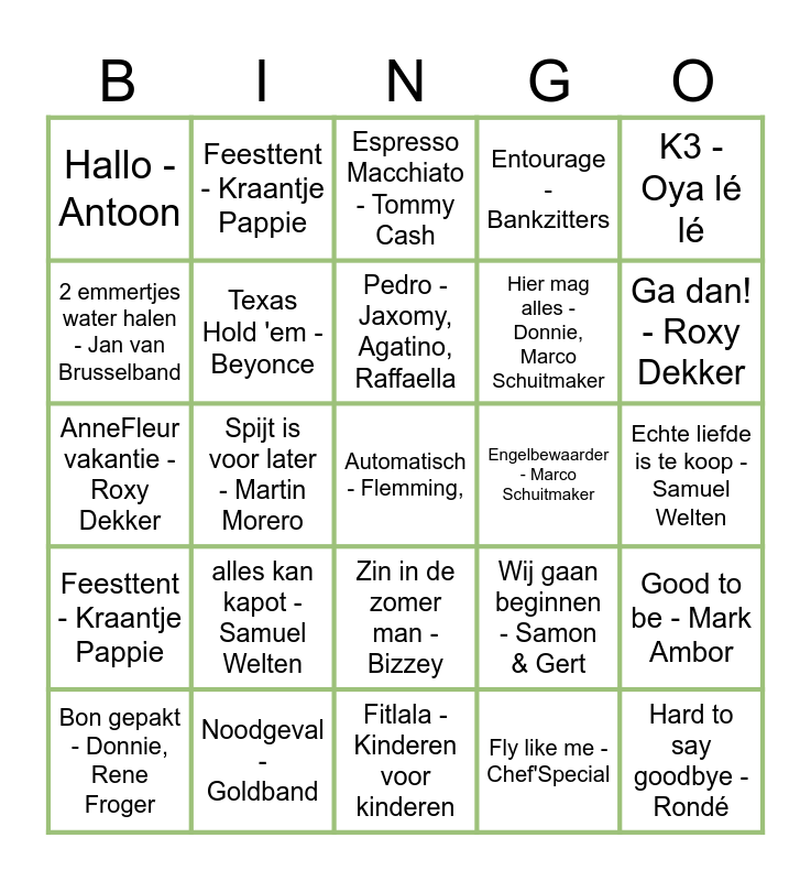 This bingo card has 40 words: K3 - 3 biggetjes, AnneFleur vakantie - Roxy Dekker, Lotje - Lustrum U.V.S.V./N.V.V.S.U., Jopke Van Dobben, Texas Hold 'em - Beyonce, Noodgeval - Goldband, Zin in de zomer man - Bizzey, Pedro - Jaxomy, Agatino, Raffaella, Weekend - Bizzey, K3 - Oya lé lé, Feesttent - Kraantje Pappie, Spijt is voor later - Martin Morero, Entourage - Bankzitters, Automatisch - Flemming,, Echte liefde is te koop - Samuel Welten, Engelbewaarder - Marco Schuitmaker, alles kan kapot - Samuel Welten, Baila de gasolina - Effe Serieus, Hallo - Antoon, 100% - flemming, mart hoogkamer, Espresso Macchiato - Tommy Cash, Good to be - Mark Ambor, Fly like me - Chef'Special, Hier mag alles - Donnie, Marco Schuitmaker, 2 emmertjes water halen - Jan van Brusselband, Mona lisa - Robert Van Hemert, Shake it off - Taylor Swift, Stargazing - Myles Smith, Goud - Suzan en Freek, Hard to say goodbye - Rondé, Ruggengraat - Snelle, Kraantje Pappie, Vanavond - Kris Kross Amsterdam, Bon gepakt - Donnie, Rene Froger, Beneden - Bizzey, Ronnie Flex, Russo, Wij gaan beginnen - Samon & Gert, Ga dan! - Roxy Dekker, Fitlala - Kinderen voor kinderen, Rampeneren - Yes-R, Partysquad, Ali B, Schultenbräu - Chantal Janzen, Donnie, Feesttent - Kraantje Pappie and Van Goes tot Purmerend - Jan Smit.
