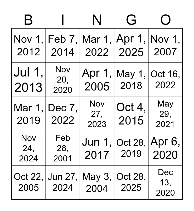 This bingo card has 25 words: Feb 28, 2001, May 3, 2004, Apr 1, 2005, Oct 22, 2005, Nov 1, 2007, Nov 1, 2012, Jul 1, 2013, Feb 7, 2014, Oct 4, 2015, Jun 1, 2017, May 1, 2018, Mar 1, 2019, Oct 28, 2019, Apr 6, 2020, Nov 20, 2020, Dec 13, 2020, May 29, 2021, Mar 1, 2022, Oct 16, 2022, Dec 7, 2022, Nov 27, 2023, Jun 27, 2024, Nov 24, 2024, Apr 1, 2025 and Oct 28, 2025.