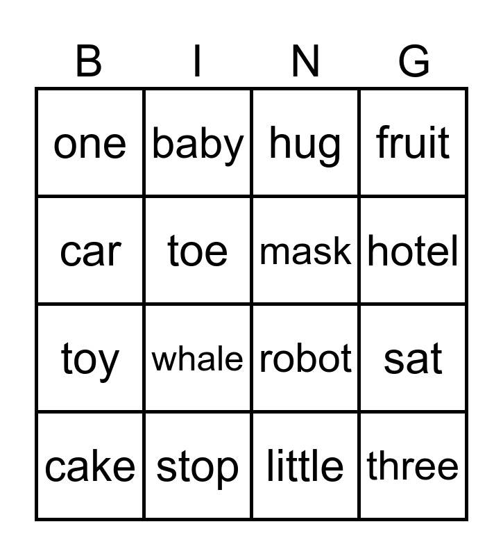 This bingo card has 31 words: Free!, mat, sat, look, one, hug, mask, stem, stop, walk, little, cake, name, bike, whale, catch, stone, bone, three, ring, car, star, cow, baby, toy, toe, fruit, robot, book, hotel and night.