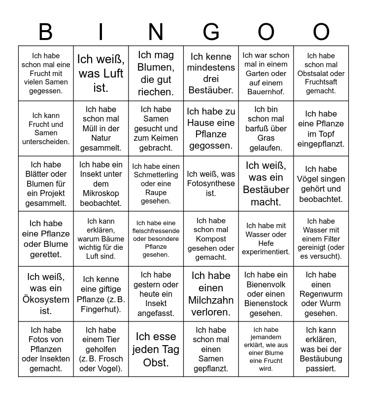 This bingo card has 36 words: Ich habe einen Milchzahn verloren., Ich habe gestern oder heute ein Insekt angefasst., Ich habe schon mal einen Samen gepflanzt., Ich kann Frucht und Samen unterscheiden., Ich habe eine Pflanze oder Blume gerettet., Ich weiß, was Fotosynthese ist., Ich habe schon mal Müll in der Natur gesammelt., Ich esse jeden Tag Obst., Ich war schon mal in einem Garten oder auf einem Bauernhof., Ich habe ein Bienenvolk oder einen Bienenstock gesehen., Ich habe eine Pflanze im Topf eingepflanzt., Ich kenne mindestens drei Bestäuber., Ich habe einen Regenwurm oder Wurm gesehen., Ich habe ein Insekt unter dem Mikroskop beobachtet., Ich habe zu Hause eine Pflanze gegossen., Ich habe schon mal eine Frucht mit vielen Samen gegessen., Ich weiß, was ein Ökosystem ist., Ich weiß, was ein Bestäuber macht., Ich habe Blätter oder Blumen für ein Projekt gesammelt., Ich mag Blumen, die gut riechen., Ich habe einen Schmetterling oder eine Raupe gesehen., Ich kann erklären, warum Bäume wichtig für die Luft sind., Ich habe schon mal Kompost gesehen oder gemacht., Ich habe eine fleischfressende oder besondere Pflanze gesehen., Ich habe mit Wasser oder Hefe experimentiert., Ich weiß, was Luft ist., Ich bin schon mal barfuß über Gras gelaufen., Ich habe einem Tier geholfen (z. B. Frosch oder Vogel)., Ich habe Samen gesucht und zum Keimen gebracht., Ich habe schon mal Obstsalat oder Fruchtsaft gemacht., Ich kann erklären, was bei der Bestäubung passiert., Ich habe Fotos von Pflanzen oder Insekten gemacht., Ich habe Wasser mit einem Filter gereinigt (oder es versucht)., Ich habe Vögel singen gehört und beobachtet., Ich kenne eine giftige Pflanze (z. B. Fingerhut). and Ich habe jemandem erklärt, wie aus einer Blume eine Frucht wird..
