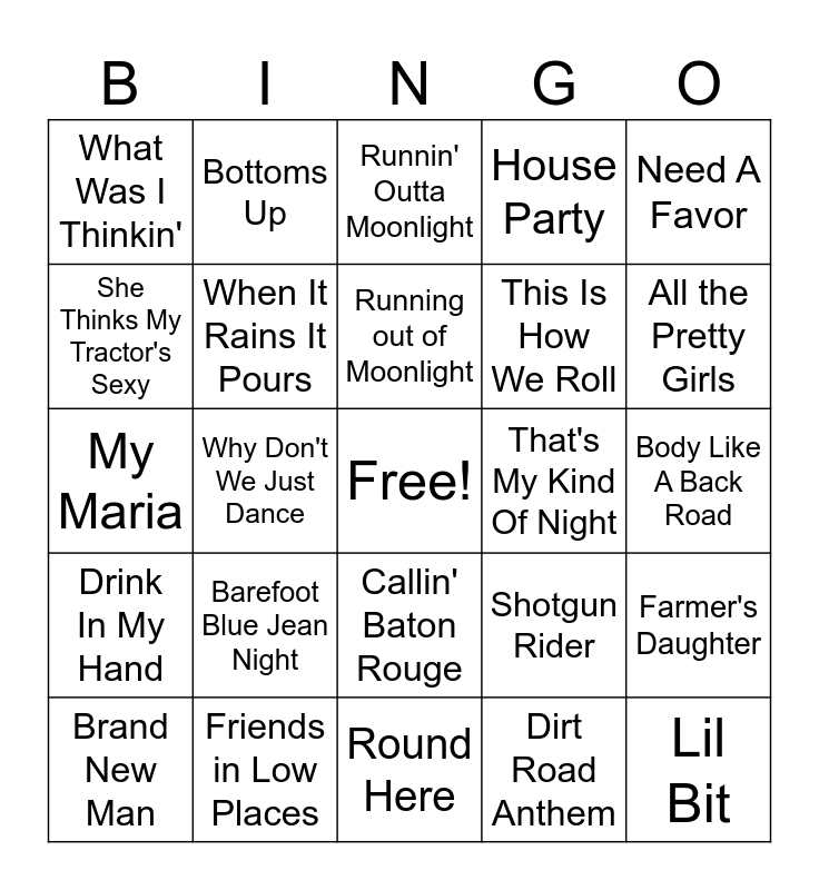 This bingo card has a free space and 40 words: American Kids, My Maria, Giddy On Up, When It Rains It Pours, Friends in Low Places, Callin' Baton Rouge, Running out of Moonlight, Bloodline, Need A Favor, Drink In My Hand, Why Don't We Just Dance, House Party, Lil Bit, Body Like A Back Road, That's My Kind Of Night, Barefoot Blue Jean Night, Homegrown, What Was I Thinkin', Cruise, Runnin' Outta Moonlight, Farmer's Daughter, Dirt Road Anthem, This Is How We Roll, She Thinks My Tractor's Sexy, Just To See You Smile, I Don't Want This Night To End, Up Down, One Margarita, She's Country, Redneck Yacht Club, Boys 'Round Here, Brand New Man, Dust On The Bottle, Shotgun Rider, All the Pretty Girls, Round Here, Get Along, Summertime, Bottoms Up and Somewhere On A Beach.