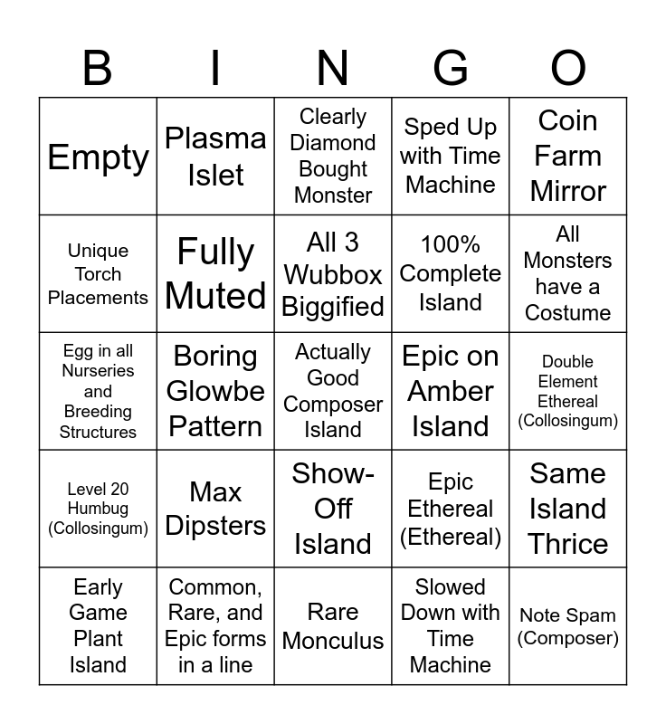 This bingo card has a free space and 24 words: Max Dipsters, Common, Rare, and Epic forms in a line, All 3 Wubbox Biggified, Early Game Plant Island, Coin Farm Mirror, Empty, Unique Torch Placements, Plasma Islet, Epic on Amber Island, Show-Off Island, 100% Complete Island, Egg in all Nurseries and Breeding Structures, Epic Ethereal (Ethereal), Same Island Thrice, Fully Muted, Slowed Down with Time Machine, Double Element Ethereal (Collosingum), Clearly Diamond Bought Monster, All Monsters have a Costume, Boring Glowbe Pattern, Note Spam (Composer), Level 20 Humbug (Collosingum), Sped Up with Time Machine and Rare Monculus.