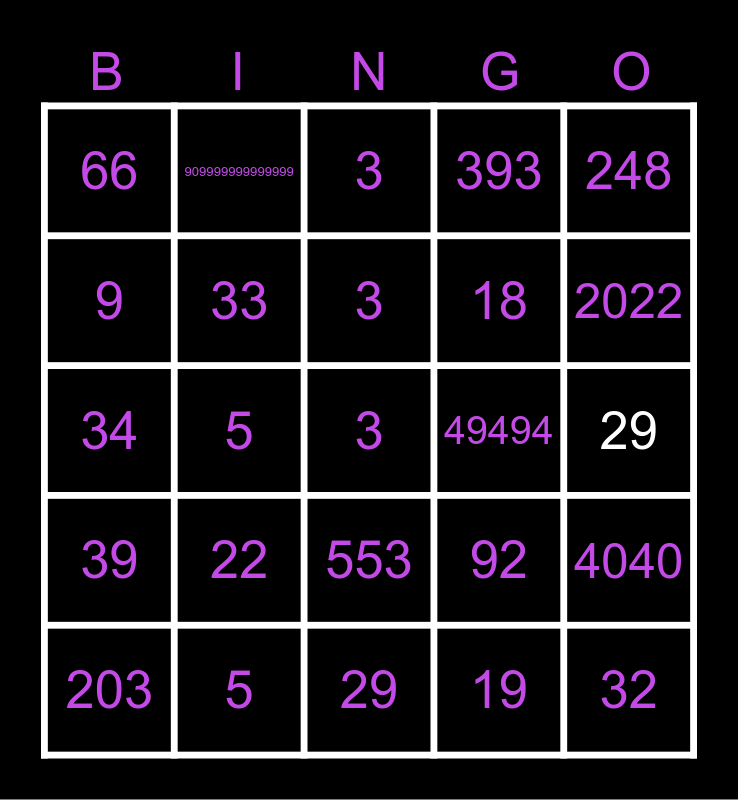 This bingo card has a free space and 24 words: 22, 5, 3, 203, 248, 66, 9, 909999999999999, 49494, 553, 18, 34, 92, 4040, 33, 19, 29, 3, 2022, 5, 32, 39, 393 and 29.
