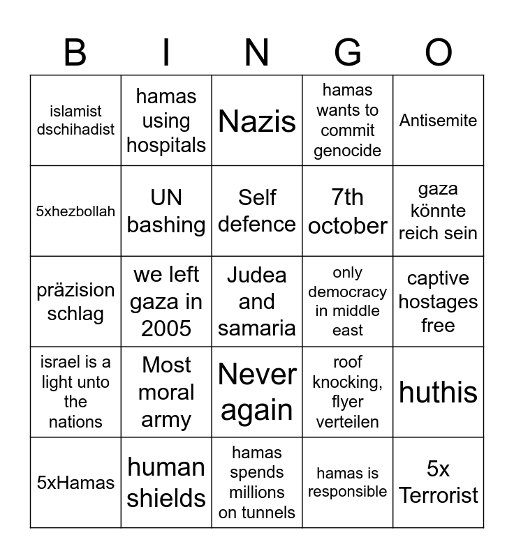 This bingo card has a free space and 24 words: Most moral army, human shields, Self defence, 5xHamas, Antisemite, islamist dschihadist, 5xhezbollah, hamas using hospitals, only democracy in middle east, Never again, 7th october, präzision schlag, roof knocking, flyer verteilen, huthis, UN bashing, hamas is responsible, captive hostages free, Nazis, gaza könnte reich sein, we left gaza in 2005, 5x Terrorist, israel is a light unto the nations, hamas wants to commit genocide and hamas spends millions on tunnels.