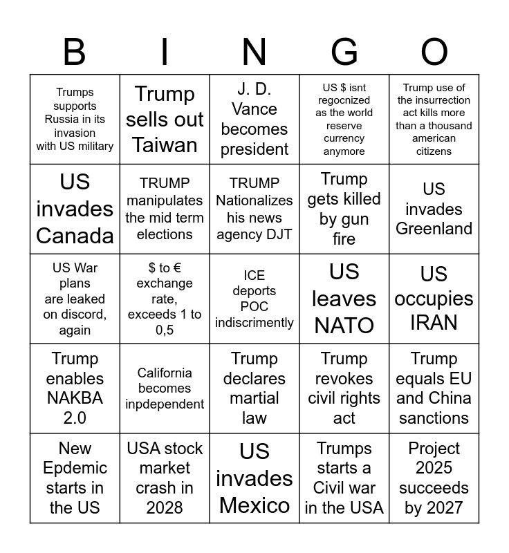 This bingo card has 25 words: California becomes inpdependent, US invades Mexico, TRUMP Nationalizes his news agency DJT, New Epdemic starts in the US, Trump use of the insurrection act kills more than a thousand american citizens, Trumps supports Russia in its invasion with US military, US invades Canada, Trump sells out Taiwan, US leaves NATO, Trump declares martial law, Trump gets killed by gun fire, US War plans are leaked on discord, again, Trump revokes civil rights act, Trump equals EU and China sanctions, TRUMP manipulates the mid term elections, Project 2025 succeeds by 2027, US occupies IRAN, J. D. Vance becomes president, US invades Greenland, $ to € exchange rate, exceeds 1 to 0,5, ICE deports POC indiscrimently, USA stock market crash in 2028, Trump enables NAKBA 2.0, US $ isnt regocnized as the world reserve currency anymore and Trumps starts a Civil war in the USA.