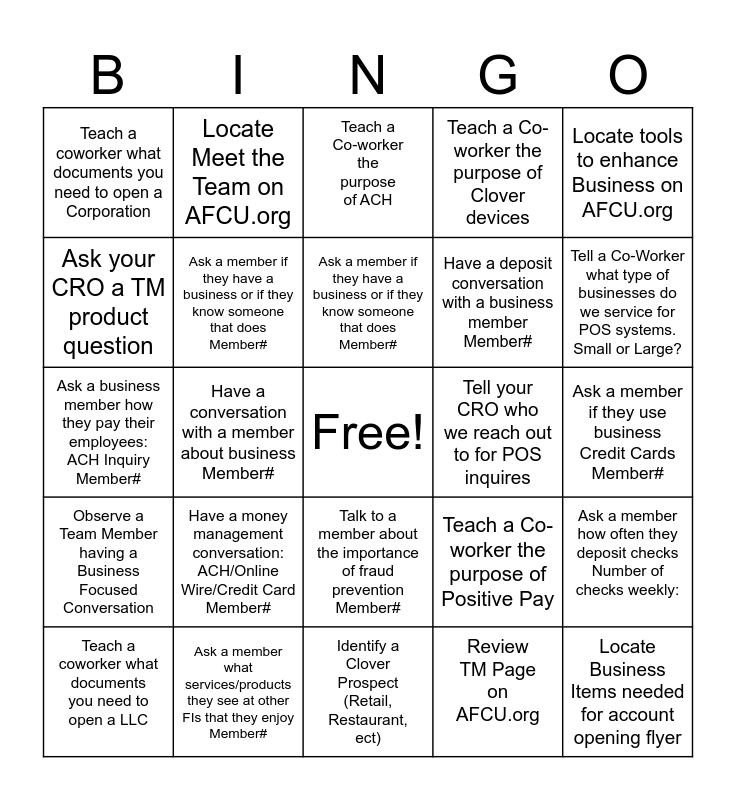 This bingo card has a free space and 24 words: Have a money management conversation: ACH/Online Wire/Credit Card Member#, Ask a member what services/products they see at other FIs that they enjoy Member#, Ask a member if they have a business or if they know someone that does Member#, Teach a coworker what documents you need to open a LLC, Locate tools to enhance Business on AFCU.org, Teach a coworker what documents you need to open a Corporation, Ask your CRO a TM product question, Locate Meet the Team on AFCU.org, Tell your CRO who we reach out to for POS inquires, Talk to a member about the importance of fraud prevention Member#, Have a deposit conversation with a business member Member#, Ask a business member how they pay their employees: ACH Inquiry Member#, Teach a Co-worker the purpose of Positive Pay, Ask a member how often they deposit checks Number of checks weekly:, Ask a member if they have a business or if they know someone that does Member#, Review TM Page on AFCU.org, Ask a member if they use business Credit Cards Member#, Teach a Co-worker the purpose of ACH, Tell a Co-Worker what type of businesses do we service for POS systems. Small or Large?, Have a conversation with a member about business Member#, Locate Business Items needed for account opening flyer, Observe a Team Member having a Business Focused Conversation, Teach a Co-worker the purpose of Clover devices and Identify a Clover Prospect (Retail, Restaurant, ect).