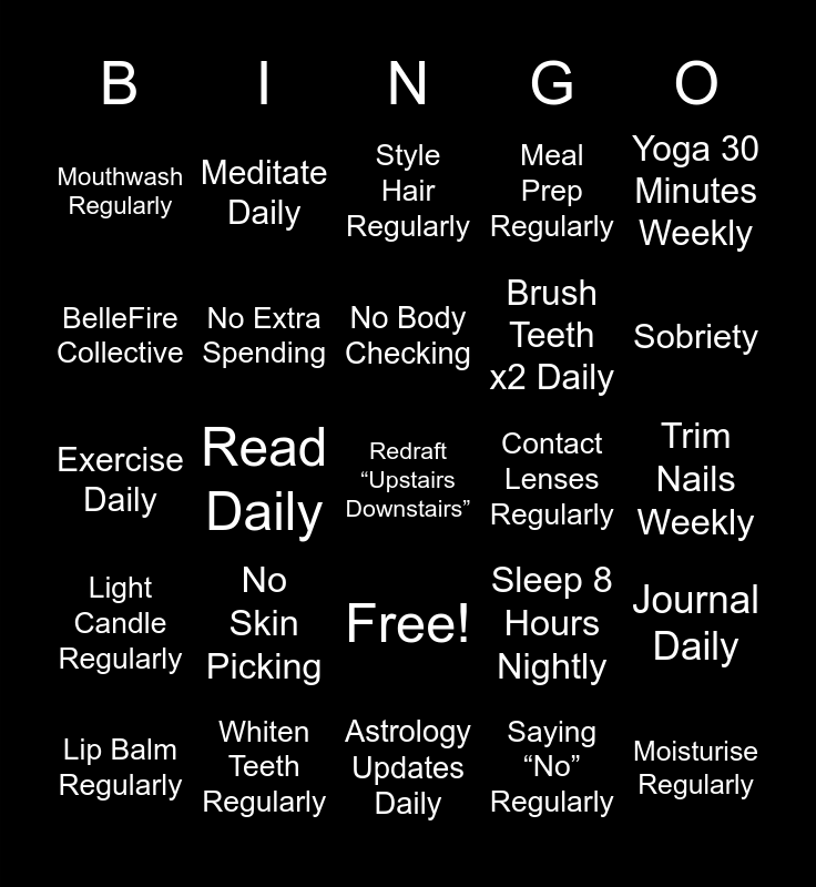 This bingo card has 26 words: Free!, Lip Balm Regularly, No Extra Spending, Checking Mail Regularly, Meal Prep Regularly, Yoga 30 Minutes Weekly, BelleFire Collective, Meditate Daily, No Body Checking, Saying “No” Regularly, Sobriety, Exercise Daily, Whiten Teeth Regularly, Astrology Updates Daily, Contact Lenses Regularly, Moisturise Regularly, Mouthwash Regularly, No Skin Picking, Style Hair Regularly, Sleep 8 Hours Nightly, Trim Nails Weekly, Light Candle Regularly, Read Daily, Redraft “Upstairs Downstairs”, Brush Teeth x2 Daily and Journal Daily.