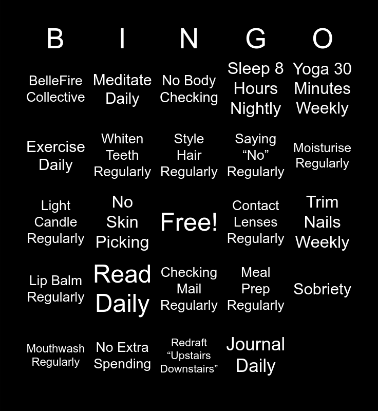 This bingo card has a free space and 24 words: Lip Balm Regularly, No Extra Spending, Checking Mail Regularly, Meal Prep Regularly, Yoga 30 Minutes Weekly, BelleFire Collective, Meditate Daily, No Body Checking, Saying “No” Regularly, Sobriety, Exercise Daily, Whiten Teeth Regularly, Astrology Updates Daily, Contact Lenses Regularly, Moisturise Regularly, Mouthwash Regularly, No Skin Picking, Style Hair Regularly, Sleep 8 Hours Nightly, Trim Nails Weekly, Light Candle Regularly, Read Daily, Redraft “Upstairs Downstairs” and Journal Daily.