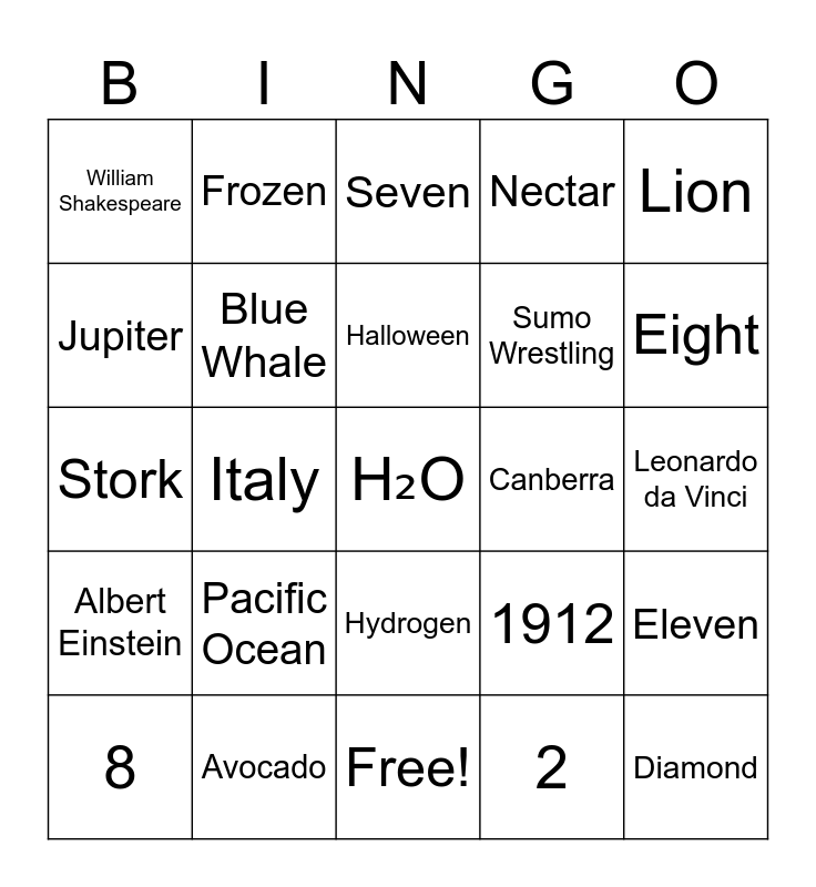 This bingo card has 31 words: Free!, Mars, Italy, Mount Everest, William Shakespeare, Seven, Blue Whale, 1912, Canberra, 2, Leonardo da Vinci, H₂O, Diamond, Japan, Eight, Carbon Dioxide, Eleven, Pacific Ocean, Albert Einstein, Hydrogen, Lion, Piano, 8, Frozen, Sumo Wrestling, Jupiter, Nectar, Stork, Avocado, Halloween and Tinker Bell.