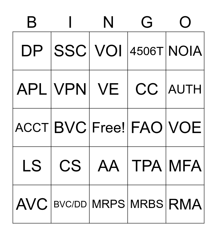 This bingo card has a free space and 29 words: AVC, HRFA, BVC, APR, DP, VOI, VPN, CS, FAO, BVC/DD, VOE, RMA, MRPS, MRBS, AUTH, ICIC, AA, LS, NOIA, ACCT, TPA, DEP, CC, APL, 4506T, SSC, MFA, VE and DL.