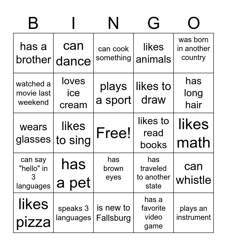This bingo card has a free space and 24 words: has a pet, speaks 3 languages, plays a sport, likes pizza, was born in another country, has a brother, watched a movie last weekend, can dance, likes to read books, has brown eyes, likes to draw, wears glasses, has traveled to another state, can whistle, loves ice cream, has a favorite video game, likes math, can cook something, has long hair, likes to sing, plays an instrument, can say "hello" in 3 languages, likes animals and is new to Fallsburg.