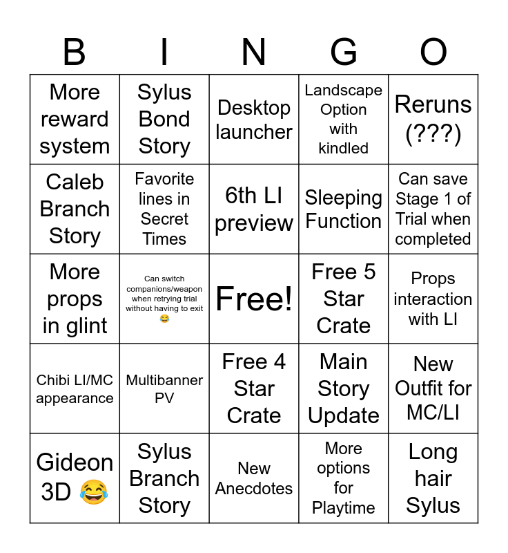 This bingo card has a free space and 24 words: Multibanner PV, Sylus Branch Story, 6th LI preview, Gideon 3D 😂, Reruns (???), More reward system, Caleb Branch Story, Sylus Bond Story, Free 5 Star Crate, Free 4 Star Crate, Sleeping Function, More props in glint, Main Story Update, New Outfit for MC/LI, Favorite lines in Secret Times, More options for Playtime, Props interaction with LI, Desktop launcher, Can save Stage 1 of Trial when completed, Can switch companions/weapon when retrying trial without having to exit 😂, Long hair Sylus, Chibi LI/MC appearance, Landscape Option with kindled and New Anecdotes.