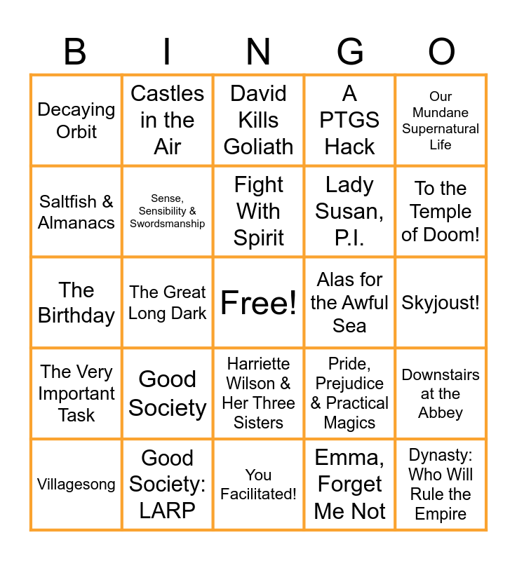 This bingo card has a free space and 24 words: Good Society, Good Society: LARP, Fight With Spirit, Villagesong, Our Mundane Supernatural Life, Decaying Orbit, Saltfish & Almanacs, Castles in the Air, Alas for the Awful Sea, Harriette Wilson & Her Three Sisters, Lady Susan, P.I., The Birthday, Pride, Prejudice & Practical Magics, Downstairs at the Abbey, Sense, Sensibility & Swordsmanship, Emma, Forget Me Not, Skyjoust!, David Kills Goliath, To the Temple of Doom!, The Great Long Dark, Dynasty: Who Will Rule the Empire, The Very Important Task, A PTGS Hack and You Facilitated!.