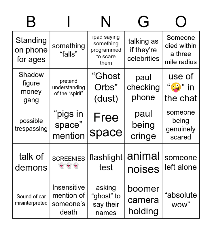 This bingo card has a free space and 24 words: SCREENIES👻👻👻, Insensitive mention of someone’s death, “Ghost Orbs” (dust), Sound of car misinterpreted, Someone died within a three mile radius, Standing on phone for ages, Shadow figure money gang, something “falls”, paul being cringe, flashlight test, paul checking phone, possible trespassing, animal noises, someone left alone, pretend understanding of the “spirit”, boomer camera holding, someone being genuinely scared, ipad saying something programmed to scare them, use of “🤪” in the chat, “pigs in space” mention, “absolute wow”, talk of demons, talking as if they’re celebrities and asking “ghost” to say their names.