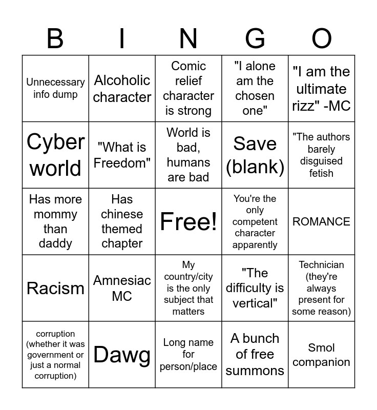 This bingo card has a free space and 24 words: Amnesiac MC, Dawg, World is bad, humans are bad, corruption (whether it was government or just a normal corruption), "I am the ultimate rizz" -MC, Unnecessary info dump, Cyber world, Alcoholic character, You're the only competent character apparently, My country/city is the only subject that matters, Save (blank), Has more mommy than daddy, "The difficulty is vertical", Technician (they're always present for some reason), "What is Freedom", A bunch of free summons, ROMANCE, Comic relief character is strong, "The authors barely disguised fetish, Has chinese themed chapter, Smol companion, Racism, "I alone am the chosen one" and Long name for person/place.
