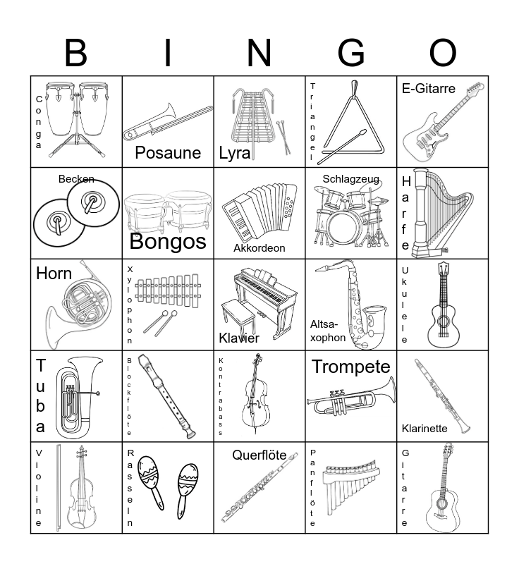This bingo card has 27 images, a free space and 27 words: Trompete, Kleine Trommel, Schlagzeug, Querflöte, Becken, Lyra, Posaune, T u b a, Altsa- xophon, Klarinette, Horn, T r i a n g e l, V i o l i n e, R a s s e l n, H a r f e, Kuhglocke, Bongos, Akkordeon, B l o c k f l ö t e, C o n g a, U k u l e l e, P a n f l ö t e, X y l o p h o n, G i t a r r e, K o n t r a b a s s, E-Gitarre and F a g o t.