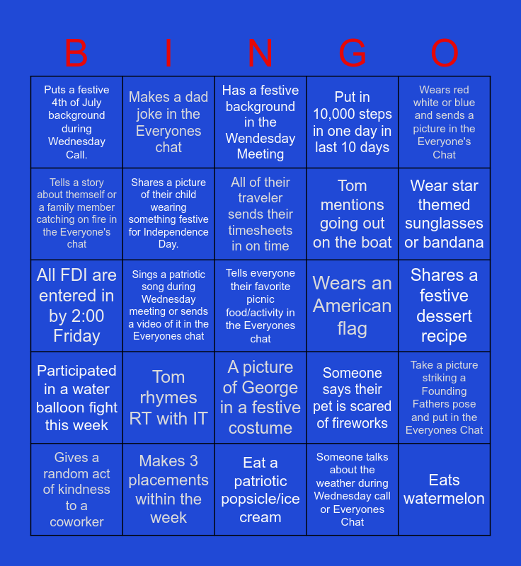 This bingo card has a free space and 24 words: Tom rhymes RT with IT, Makes 3 placements within the week, All of their traveler sends their timesheets in on time, Gives a random act of kindness to a coworker, Wears red white or blue and sends a picture in the Everyone's Chat, Puts a festive 4th of July background during Wednesday Call., Tells a story about themself or a family member catching on fire in the Everyone's chat, Makes a dad joke in the Everyones chat, Wears an American flag, A picture of George in a festive costume, Tom mentions going out on the boat, All FDI are entered in by 2:00 Friday, Someone says their pet is scared of fireworks, Take a picture striking a Founding Fathers pose and put in the Everyones Chat, Shares a picture of their child wearing something festive for Independence Day., Someone talks about the weather during Wednesday call or Everyones Chat, Shares a festive dessert recipe, Has a festive background in the Wendesday Meeting, Wear star themed sunglasses or bandana, Sings a patriotic song during Wednesday meeting or sends a video of it in the Everyones chat, Eats watermelon, Participated in a water balloon fight this week, Put in 10,000 steps in one day in last 10 days and Eat a patriotic popsicle/ice cream.