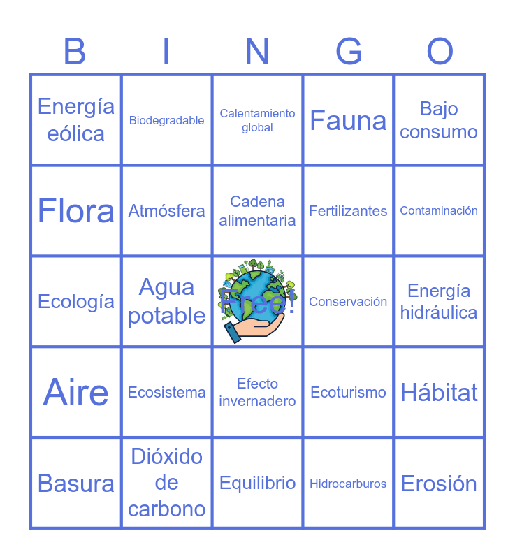 This bingo card has a free space and 33 words: Manto Acuífero, Aerosol, Agua potable, Aguas residuales, Aire, Atmósfera, Bajo consumo, Basura, Biodegradable, Biodiversidad, Cadena alimentaria, Calentamiento global, Capa de ozono, Clima, Conservación, Contaminación, Dióxido de carbono, Ecología, Ecosistema, Ecoturismo, Efecto invernadero, Energía solar, Energía eólica, Energía hidráulica, Equilibrio, Erosión, Fauna, Fertilizantes, Flora, Hábitat, Hambruna, Hidrocarburos and Huella ecológica.